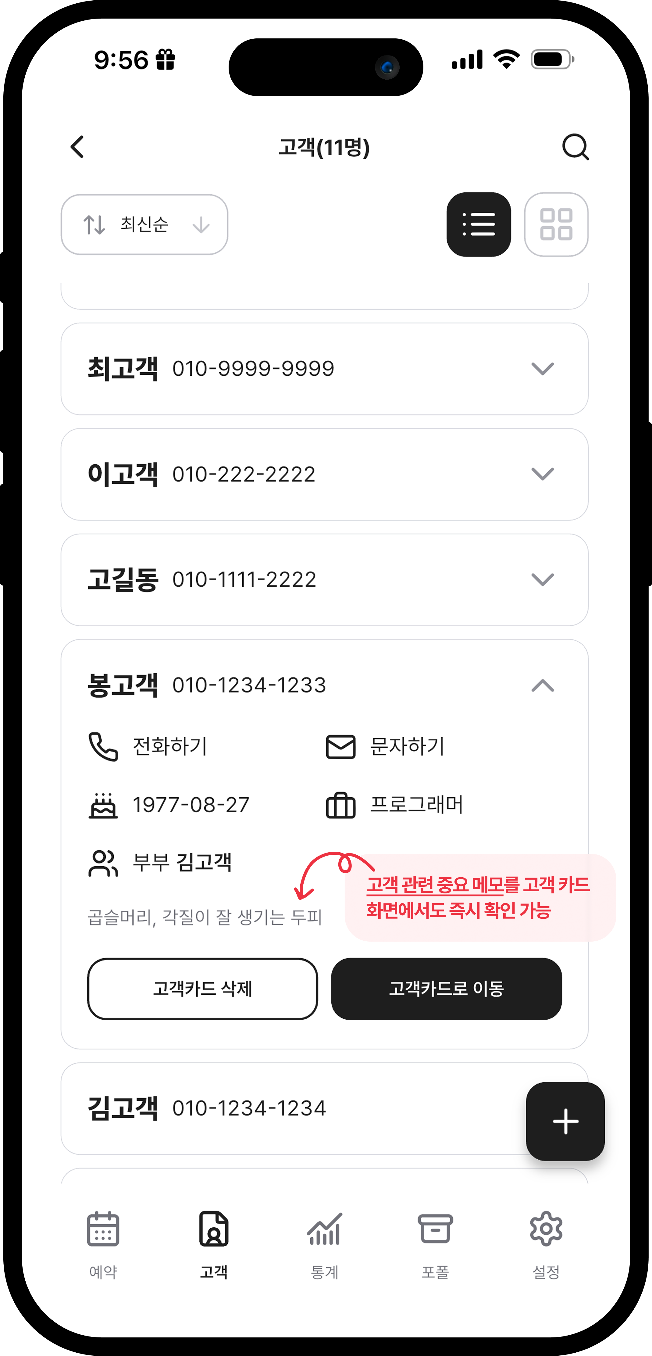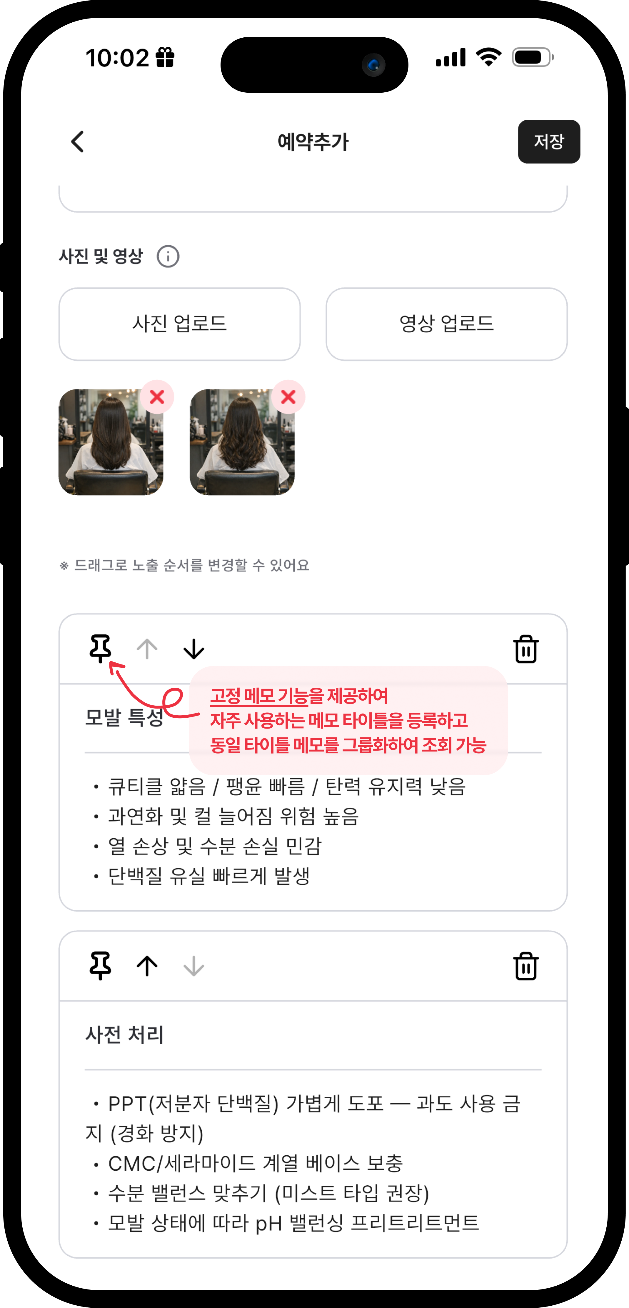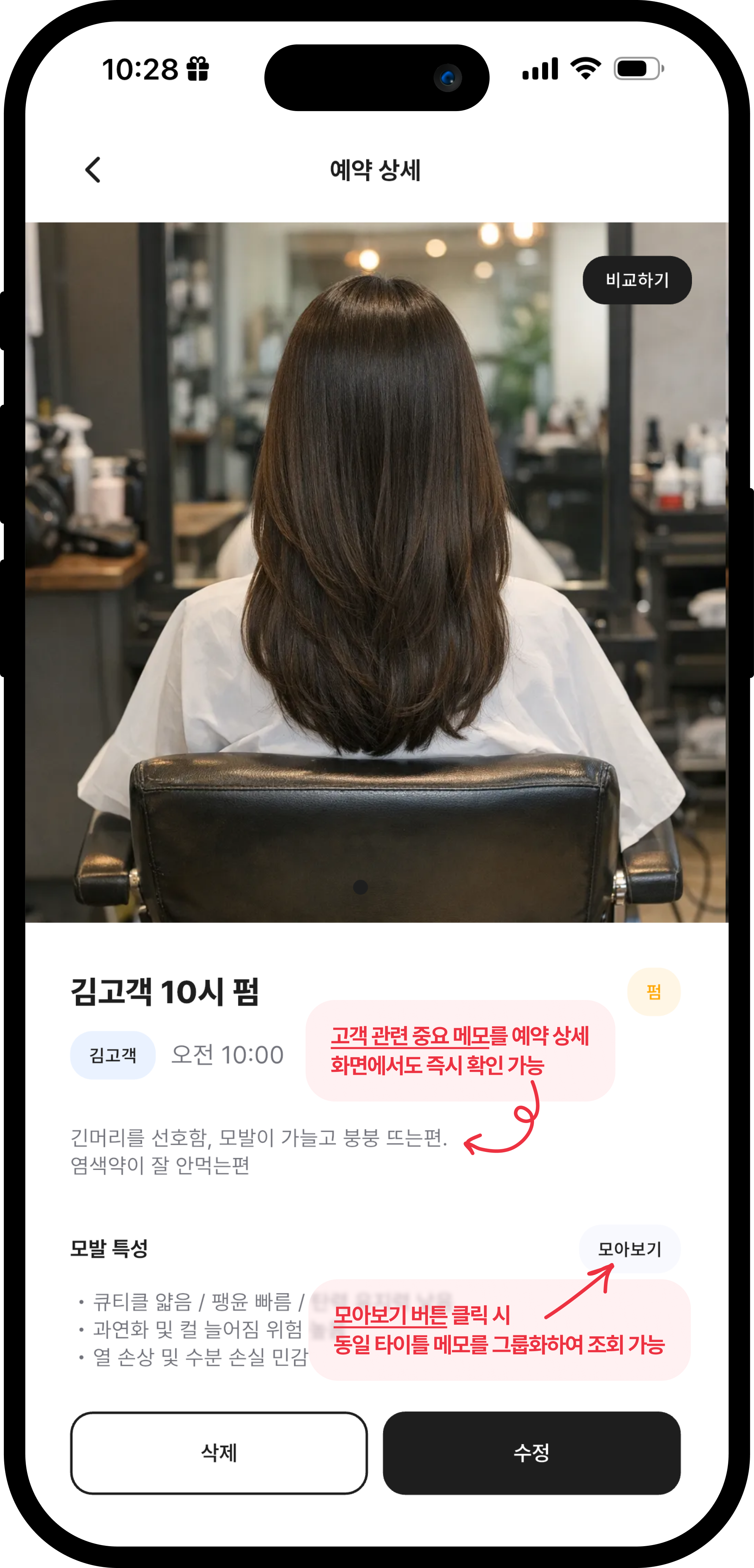 고객마다 고정 메모를 기록해 취향과 특징을 쉽게 기억할 수 있습니다.